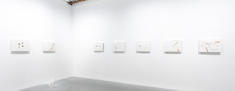 Field Work explores the materiality of our most intimate locus: the home. I am interested in disarray and clutter hidden in our drawers and behind cupboards - finding meaning in the neglected, and value in the discarded. My work seeks to cast light on everyday objects by disrupting the traditional line between painting and sculpture. Using a rudimentary casting process and plaster, Field Work reframes everyday objects by cataloguing and presenting personal detritus as poetic containers of narrative and identity. Simultaneously, the work offers glimpses into our idiosyncrasies and habits of consumption. It sees humour and comfort in the mundane and questions whether our familiar routines shield us from the unpredictable outside world - or confront us with our complicity in over-consumption.